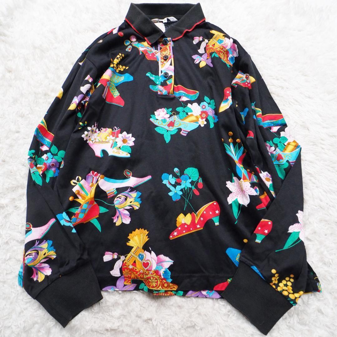 > レオナールスポーツ LEONARD SPORT 長袖シャツ カットソー ポロシャツ ブラック 総柄 日本製 コットン100%生地 レディースMサイズ