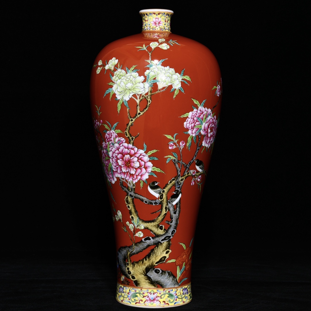 > 多宝閣 ■ 0174UL.9中国磁器 中国骨董【清朝乾隆時代:紅花鳥文梅花瓶】工芸品 施釉陶 陶芸 置物 收藏品 孤品