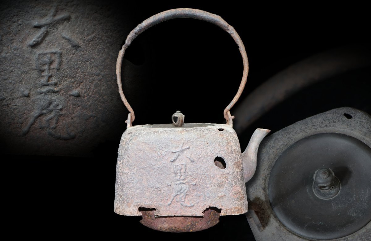 - 【江】釜師名人造『大黒庵』 荒肌虫喰尾垂鉄四方鉄瓶 高さ25㎝ 古美術品(茶道具茶器薬缶湯沸)X1801 CTDBetii