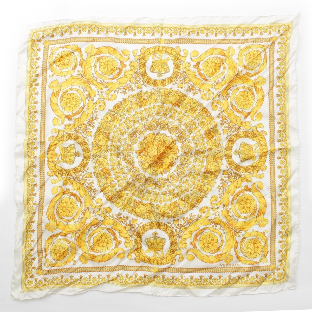 > ヴェルサーチェ シルク バロッコ ラージ 総柄 花柄 スカーフ IF07001 ホワイト イエロー 90cm【中古】