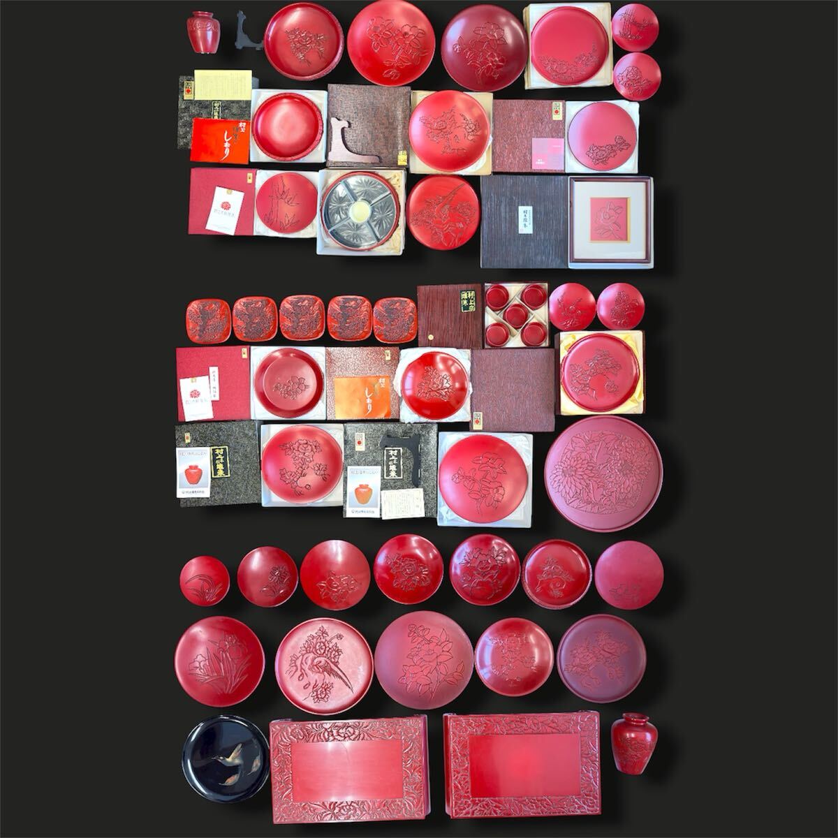 - 【まとめ売り】村上木彫堆朱/村上堆朱 伝統工芸 漆器 大量セット 皿・碗・盃・盆・花瓶・茶托・菓子器・箸ほか 桐箱付 コレクション放出