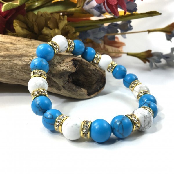 > パワーストーン ターコイズ×ハウライト ブレスレット (ゴールド) 10mm メンズ・レディース 成功 繁栄 安全