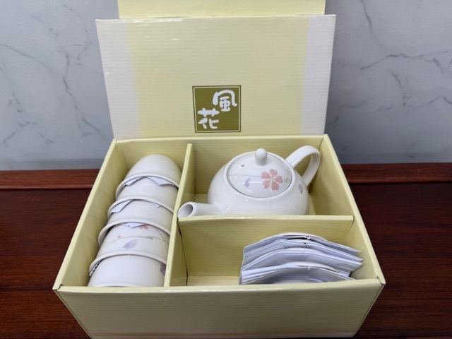 - 風花 はないろ ポット茶器 急須 湯呑 菓子皿 花柄 茶器 5客セット 経年保管品