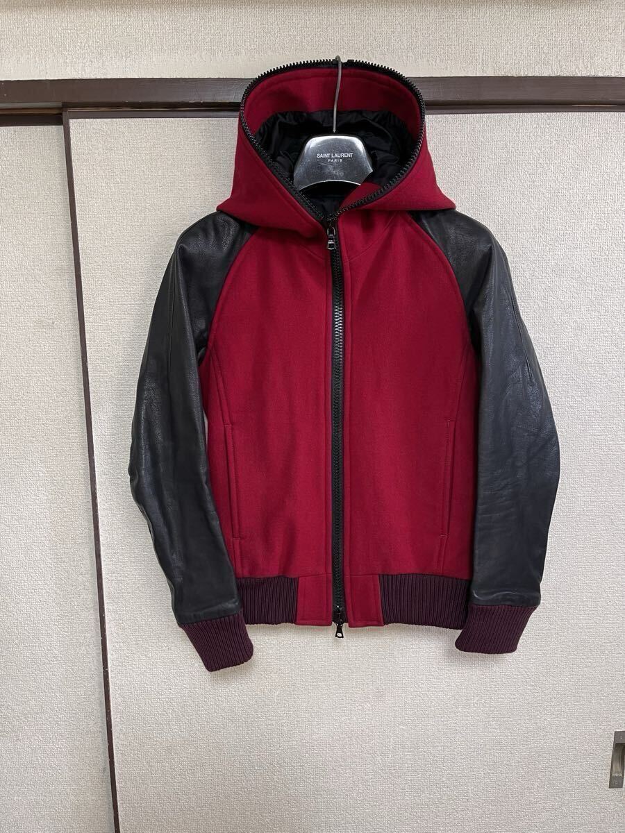 > 【即決】【良品】 ATTACHMENT アタッチメント MELTON HOODED BLOUSON 袖レザーフーデッドブルゾン ジャケット BLACK × RED 即決早い者勝ち