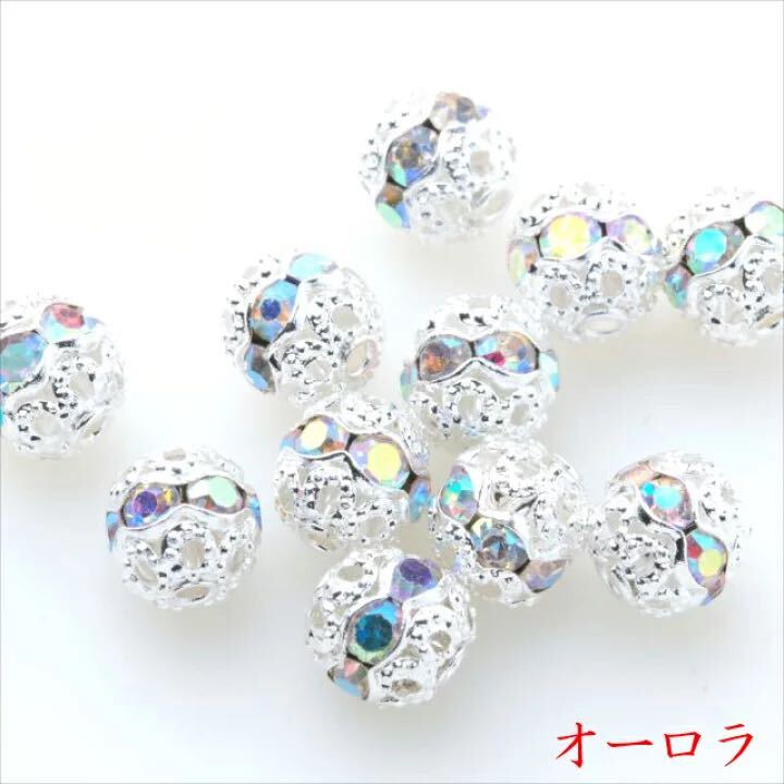 > R-386 丸ロンデル 6mm ホワイトシルバー オーロラ 10個 銀 ボール メタルビーズ スペーサー 天然石 キラキラ ラインストーン HARU雑貨rk