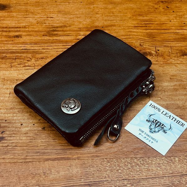 - ミドル メンズ 財布 二つ折り財布 本革 牛革 クロムレザー バイカー ウォレット チャーム 新品 未使用 送料無料 一円 1円 ブラック黒