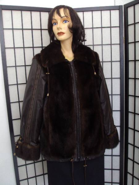 - ブラウン・ミンク&レザー毛皮ジャケット サイズ4-6