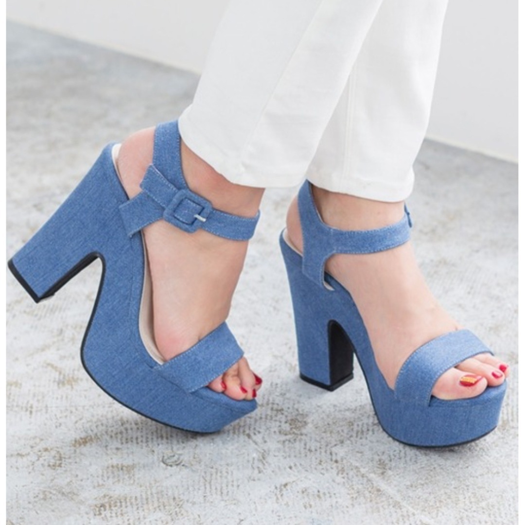- 新品 美脚 厚底 ベルト サンダル デニム 24cm レディース シューズ スリッパ 12cmヒール 前厚4cm クッションインソール スナップボタン 青