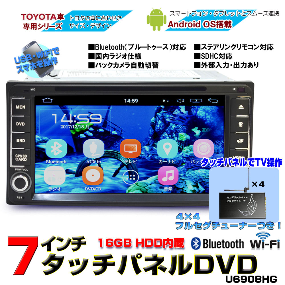 - トヨタダイハツモデル 瞬間起動7インチカーナビ アンドロイド DVD CPRM 16G スマホ iPhone+専用4x4地デジフルセグチューナーセット