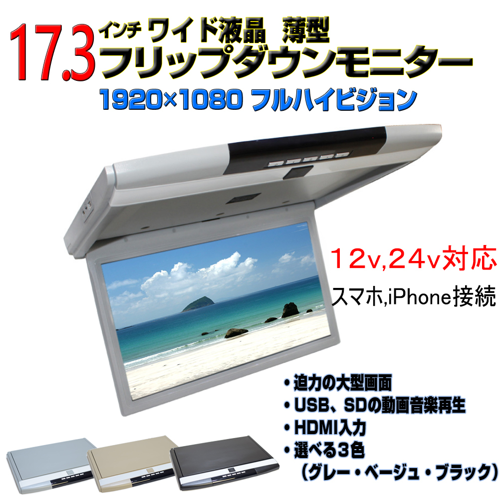- 【一年保証】フリップダウンモニター17.3インチ 1920×1080pix 高画質 フルハイビジョン WXGA液晶モニター 3色 スピーカー HDMI USB SD