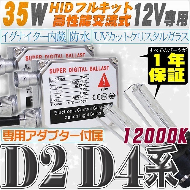 - 高性能 HIDキット 35W 【D2C/R/S】【D4C/R/S】 リレー付 12000K 【交流式バラスト&クリスタルガラスバーナー】