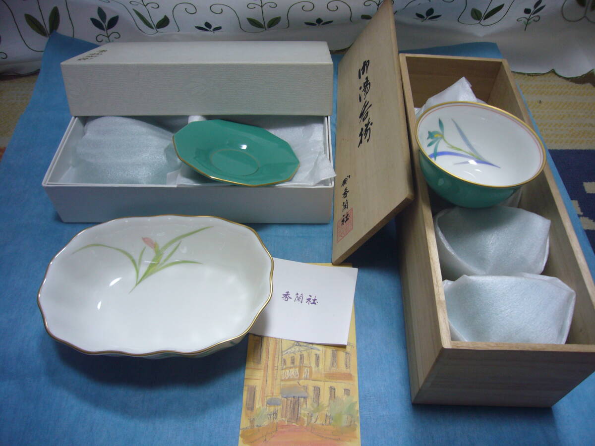 - 香蘭社 湯呑み セイントジョーン 茶托10角形 グリーン 長方形鉢 バスケット