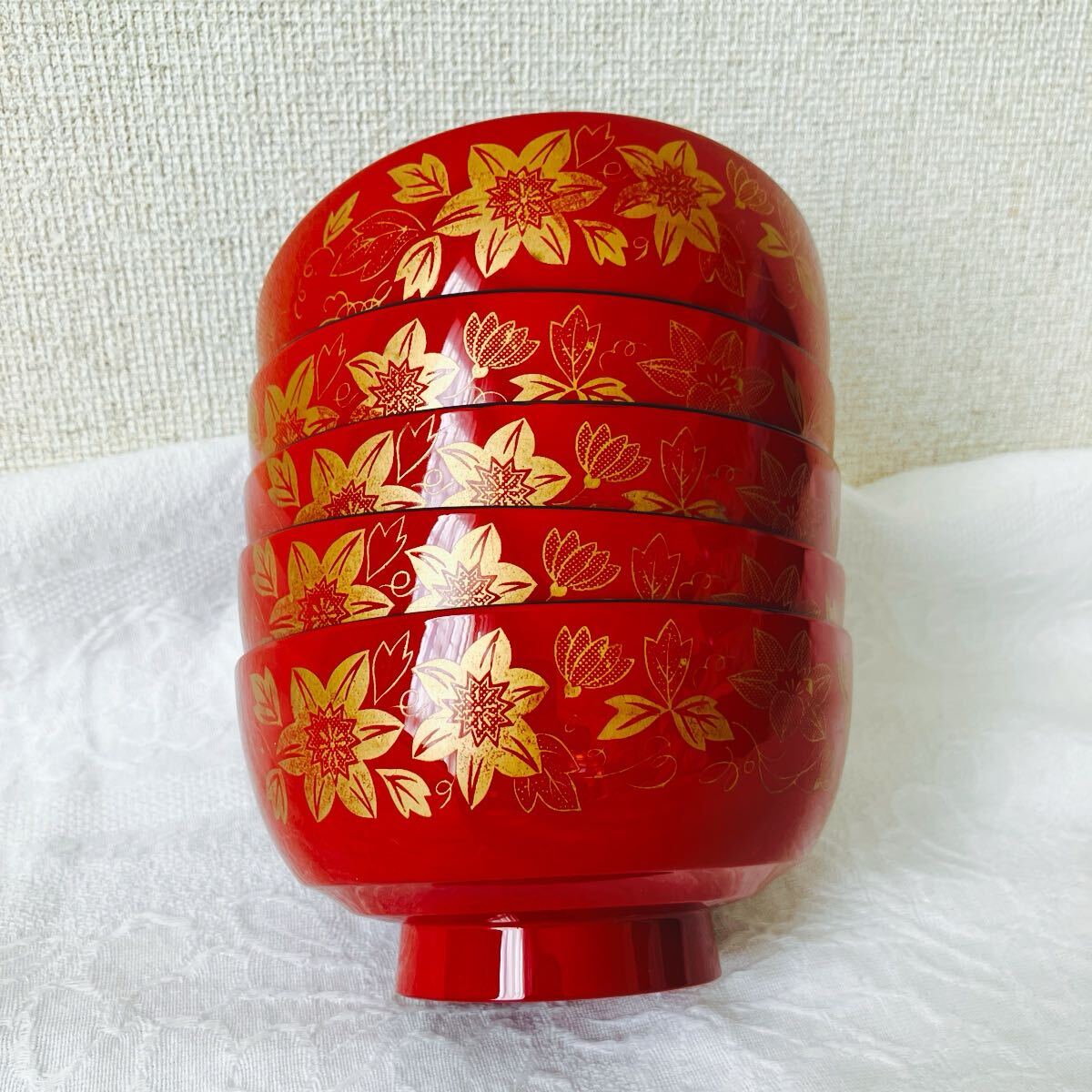 - m38)汁碗 朱色 花柄 5客セット 味噌汁 吸い物 昭和 レトロ ビンテージ 食器 ヴィンテージ 皿