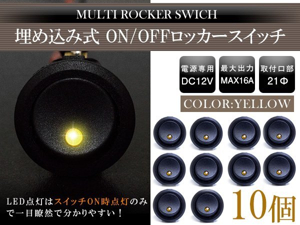 > 【新品即納】『10個』丸型 ON/OFFスイッチ 21mm 21φ ロッカースイッチ 12V イエロー 黄色 船 キャンピングカー 埋め込み 増設スイッチ