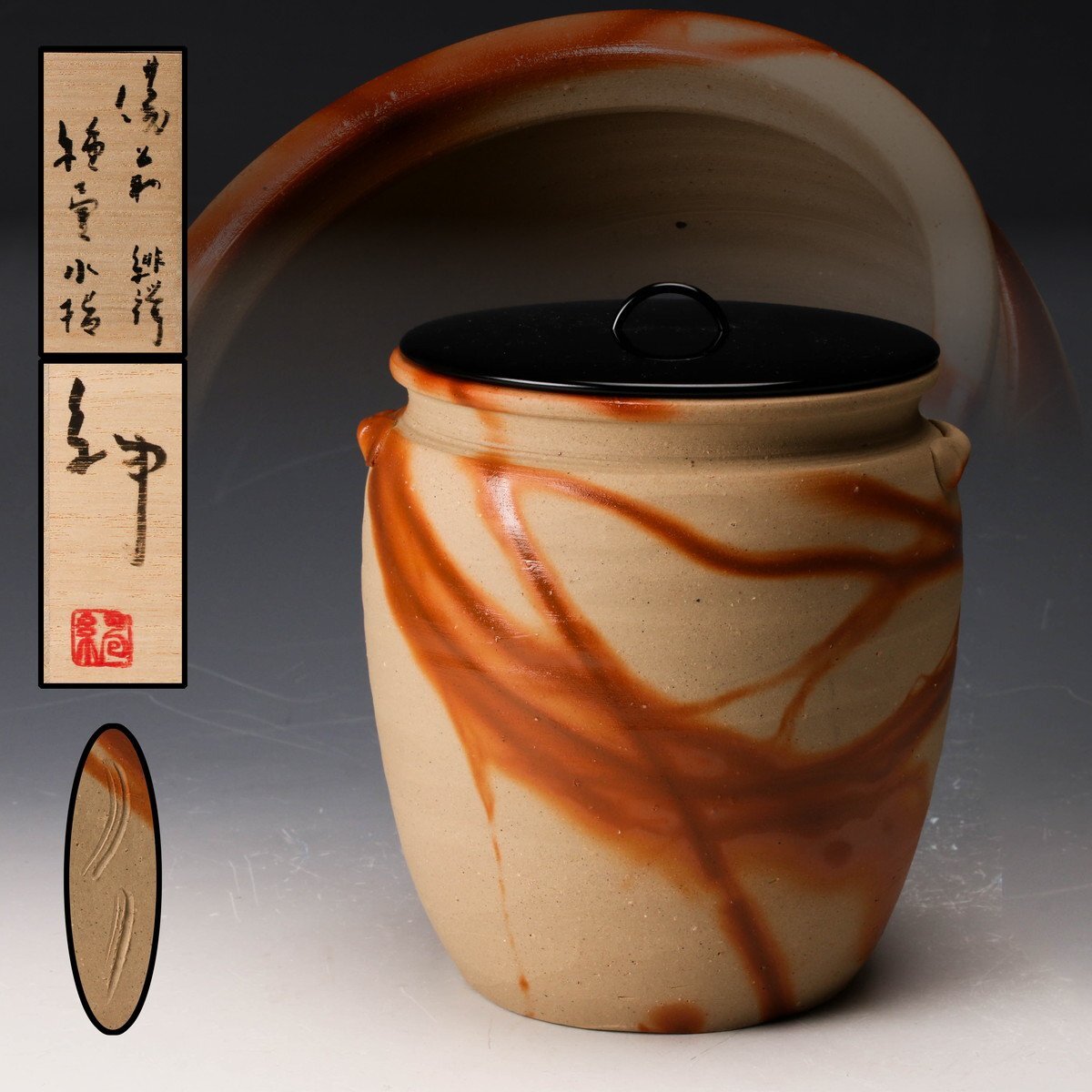 - 【佳香】伊勢崎紳 備前緋襷種壷水指 共箱 共布 栞 塗蓋 茶道具 本物保証