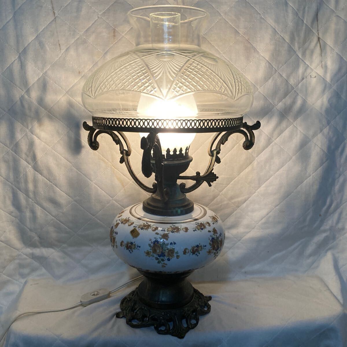 - 1900年代.古いイタリア製.スタンドランプ.台座.ホヤを置く台は象嵌要り銅.中のホヤは半分磨りガラス.外のホヤは切子硝子.電球付き.稼働品.