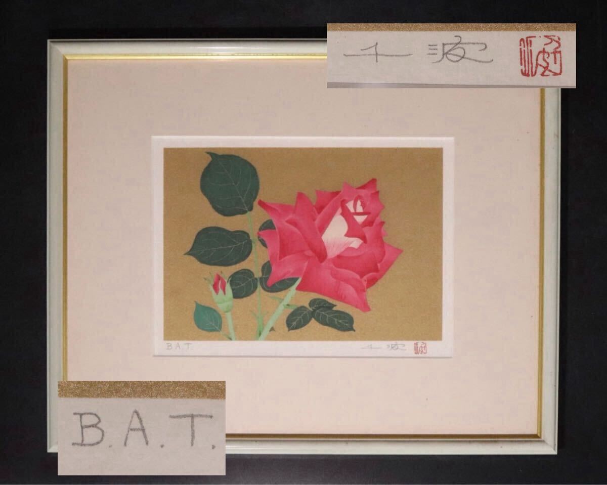 - 【真作】 中島千波 直筆サイン 入り 版画 薔薇 バラ図「B.A.T」 額装 / 画家 日本画家 .B1152
