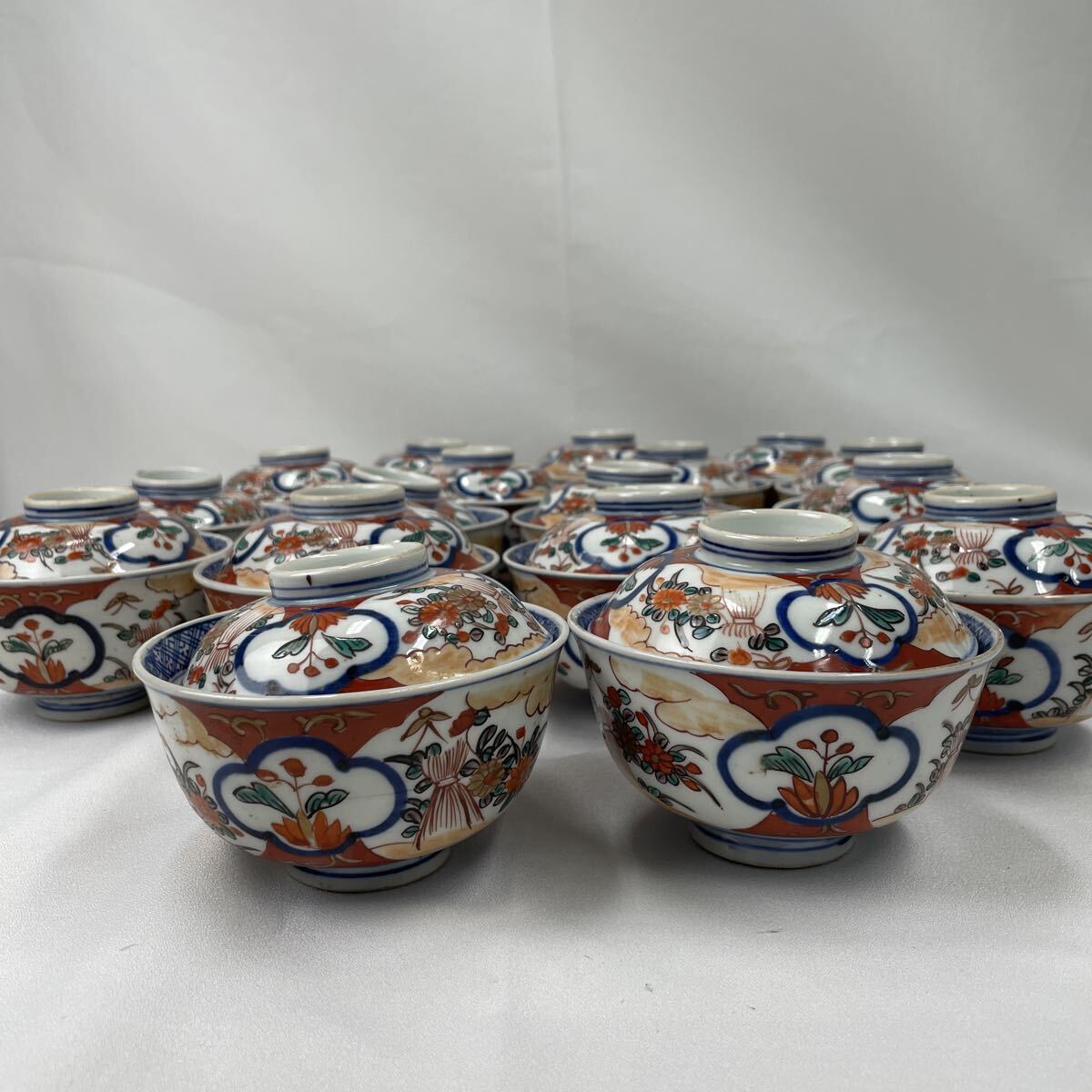 - 【1円〜】蓋付き椀 17点 まとめ売り 蓋茶碗 赤絵 染付 色絵 蓋碗 花 和食器 ジャンク品【TU01821】