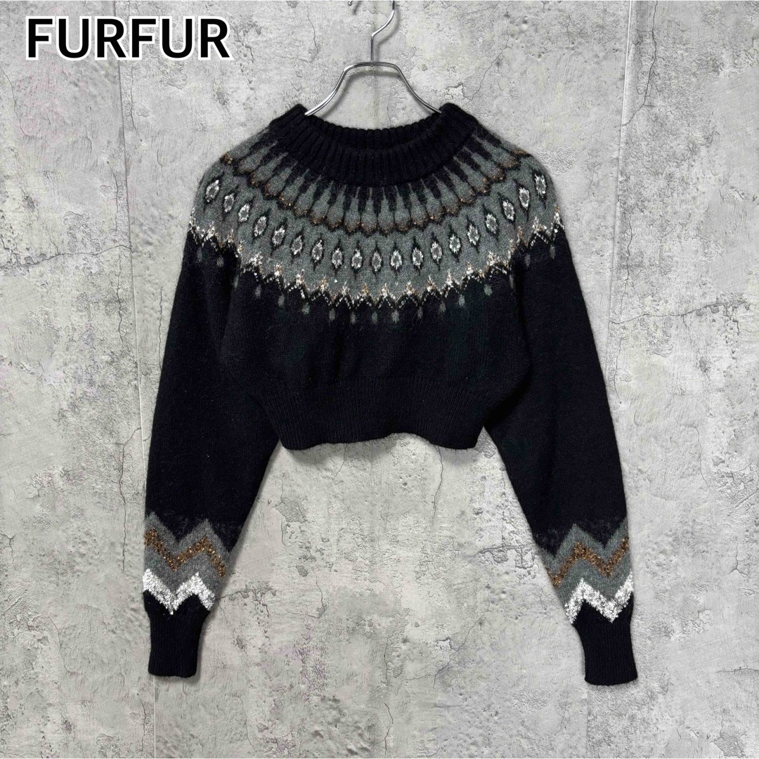 - 【美品】FURFUR ファーファー ノルディック柄クロップド丈ニットプルオーバー 黒 ブラック フリーサイズ