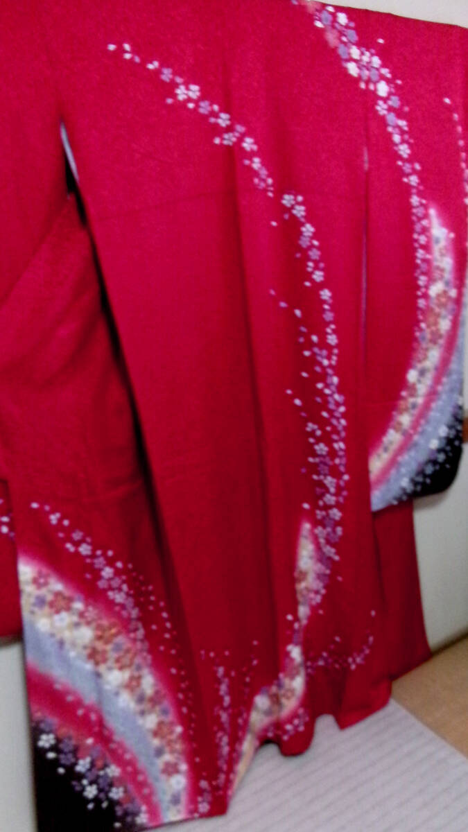 - 190【セットで】トールサイズ※成人式※美品※本振袖※赤色桜舞う模様※金駒刺繍※正絹※袷※長襦袢付き※振袖着物 丈171 裄71