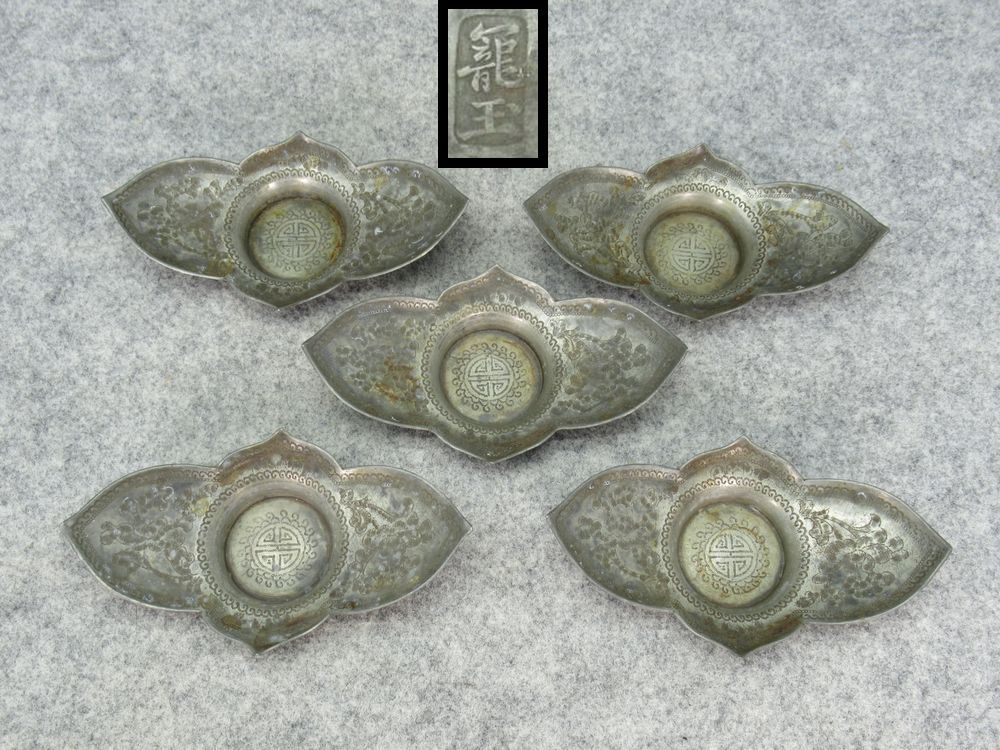 - 【蔵出し屋】煎茶道具 籠玉 在銘 古錫 斑紋 茶托 五客揃い 検/ 沈存周 古玩 唐物 唐錫 煎茶器 朱泥 急須 茶入 茶壷