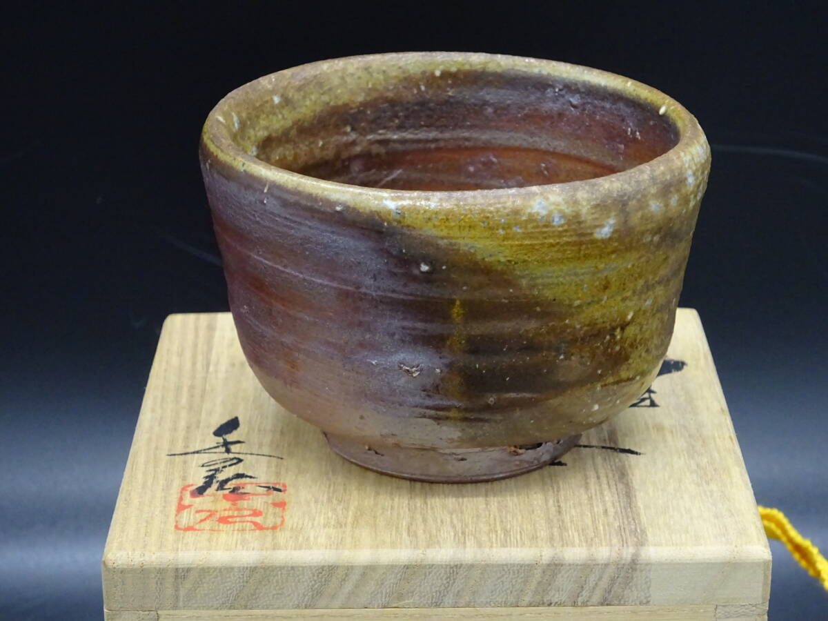> 備前焼 人気実力作家 小川秀蔵(初代小西陶古の孫)工芸会正会員★備前窯変黄ゴマぐいのみ 共箱、共布、陶歴付 茶道具