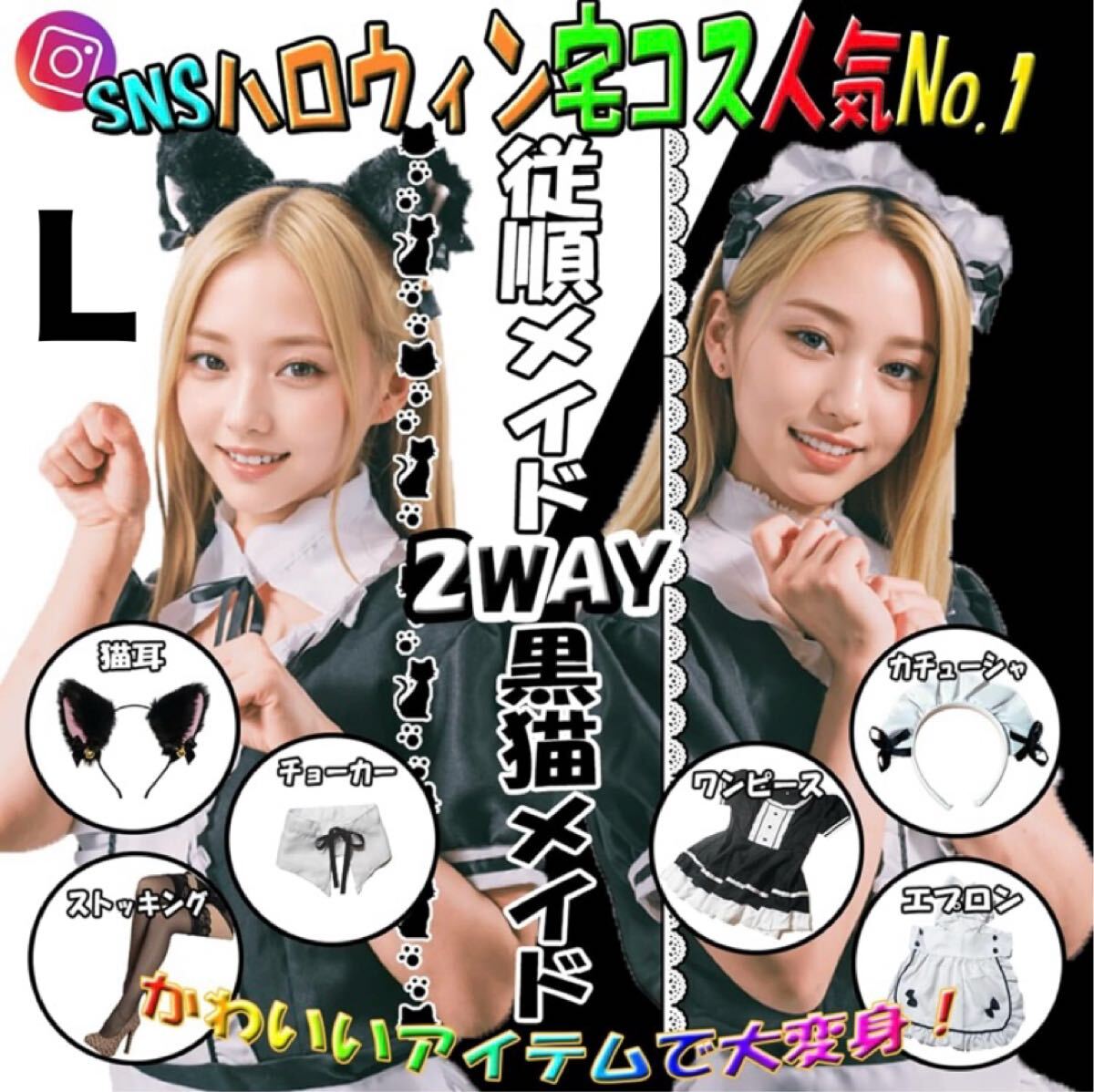 - 【2WAY】変身黒猫メイド服 6点セット レディースL ハロウィン コスプレ ワンピース エプロン カチューシャ 猫耳 衣装 イベント 学園祭 953