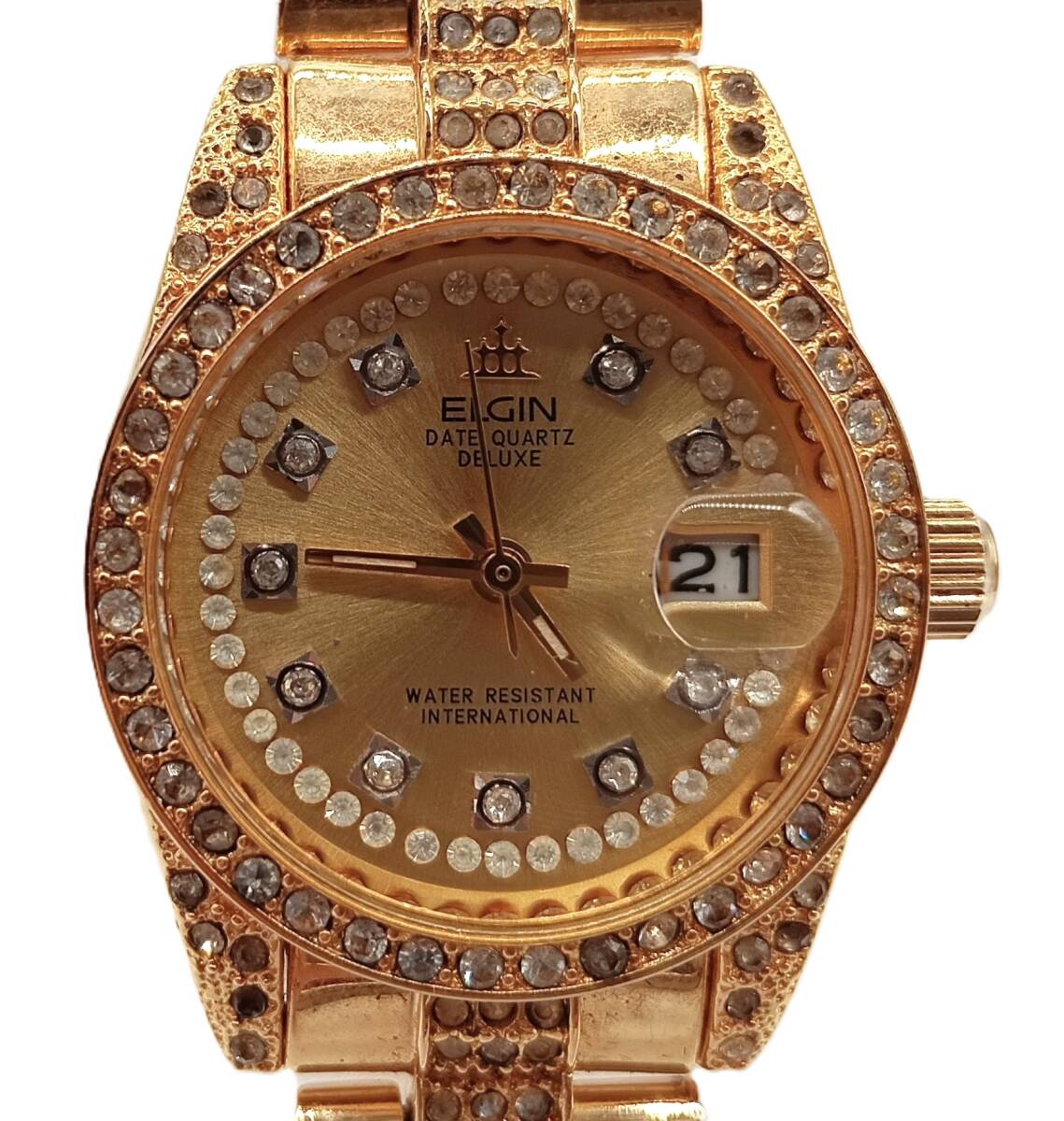 - 不動品【 ELGIN 腕時計 FK-643-C 】エルジン レディース 3針 腕時計 ゴールド文字盤 ゴールドカラー デイト クォーツ QZ 保管品 中古品 MN
