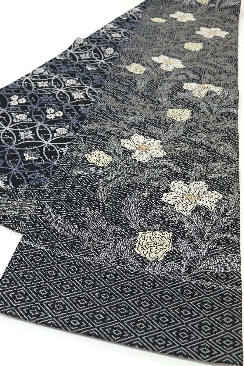 ※こちらの商品にはお仕立てはついておりません。(おおよそのお仕立て上がりの長さは、約4m89cm) 西陣織元『廣部商事』謹製、双図袋帯(全通)をご紹介致します。 こちらの帯は、帯の長さ半分より左右の柄が違っておりますので、二通りにお楽しみ頂けます。 ややふっくらとした双図柄の帯地は、黒色のお色目でございます。 タレ先から胴の半分までは銀糸やオフホワイト、薄黄色などのお色目で、入子菱と花模様が織り上げられております。 また、もう一方は紺鼠色や灰白色、オフホワイトのお色目で、七宝文が織り上げられております。 小紋や紬、色無地などお洒落着に合わせて、幅広くお使い頂けることでしょう。 ※当店のページに掲載しております、画像や文章の無断転載はご遠慮いただきますよう、宜しくお願い致します。