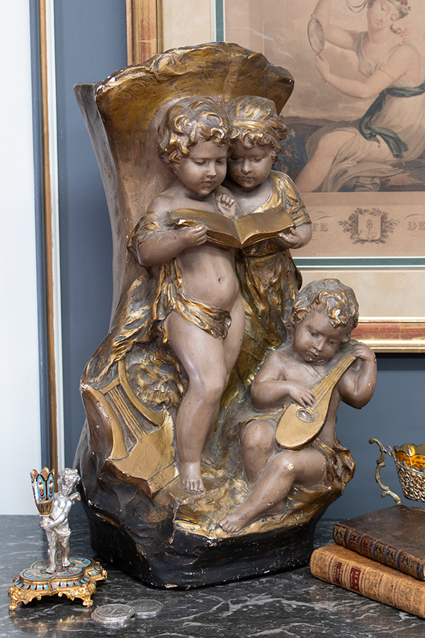 今回の彫像は、真剣な顔をして大きな本をのぞき込み、またリュート(楽器)を奏でる3人のプットーの様子が表現されています。