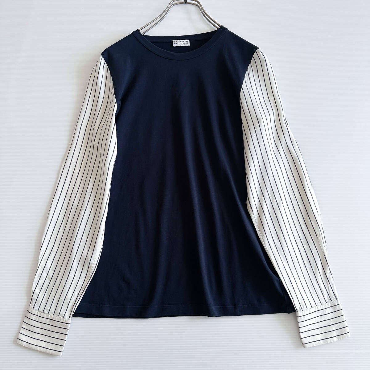 - BRUNELLO CUCINELLI ブルネロクチネリ / シルク袖 カットソー S 紺×白 シルク袖 イタリア製 ネイビー ホワイト
