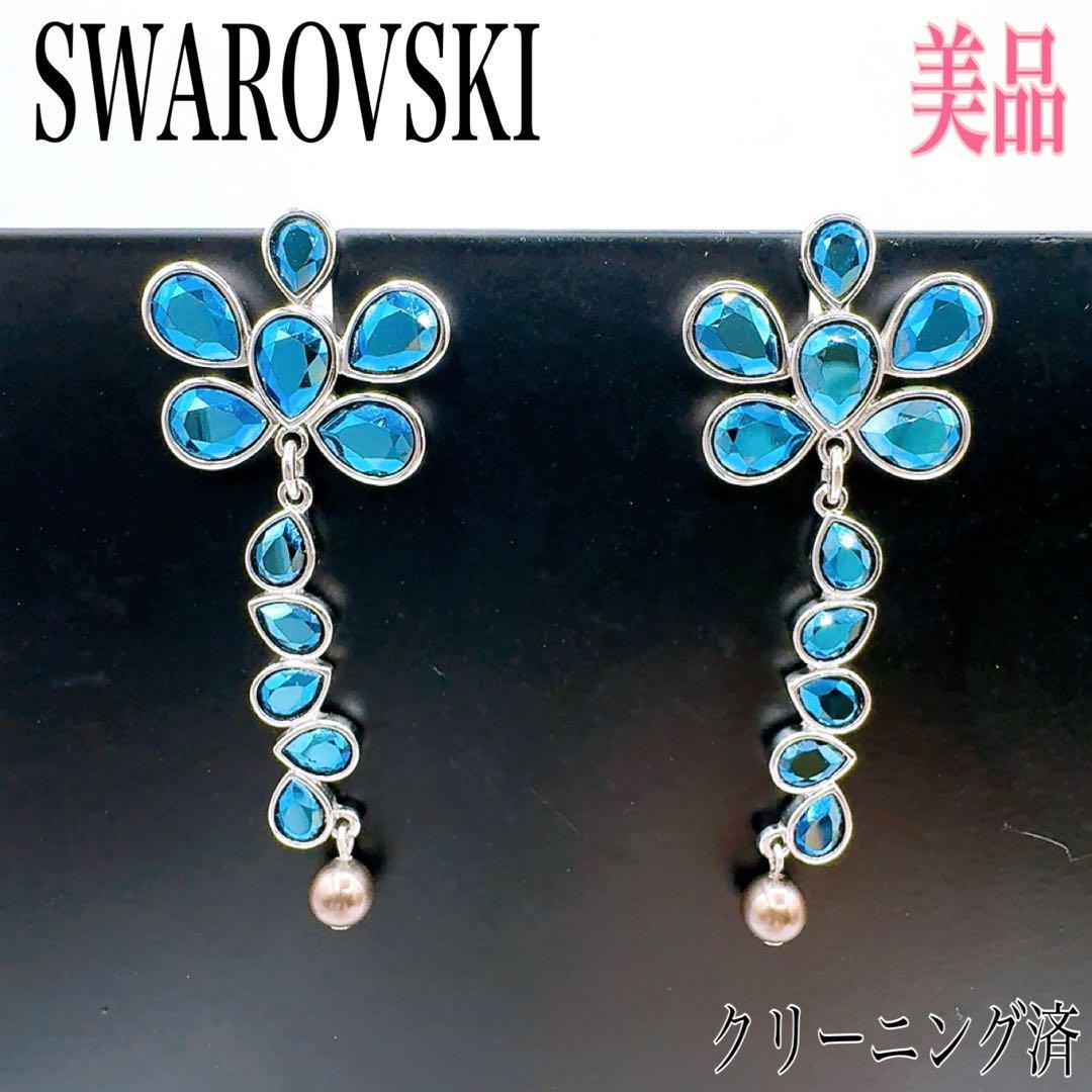 > 【レア/高品質/美品】SWAROVSKI スワロフスキー ロング ピアス 両耳 ブルー クリスタル フラワー 花 ブルー/グレー×シルバー アクセサリー