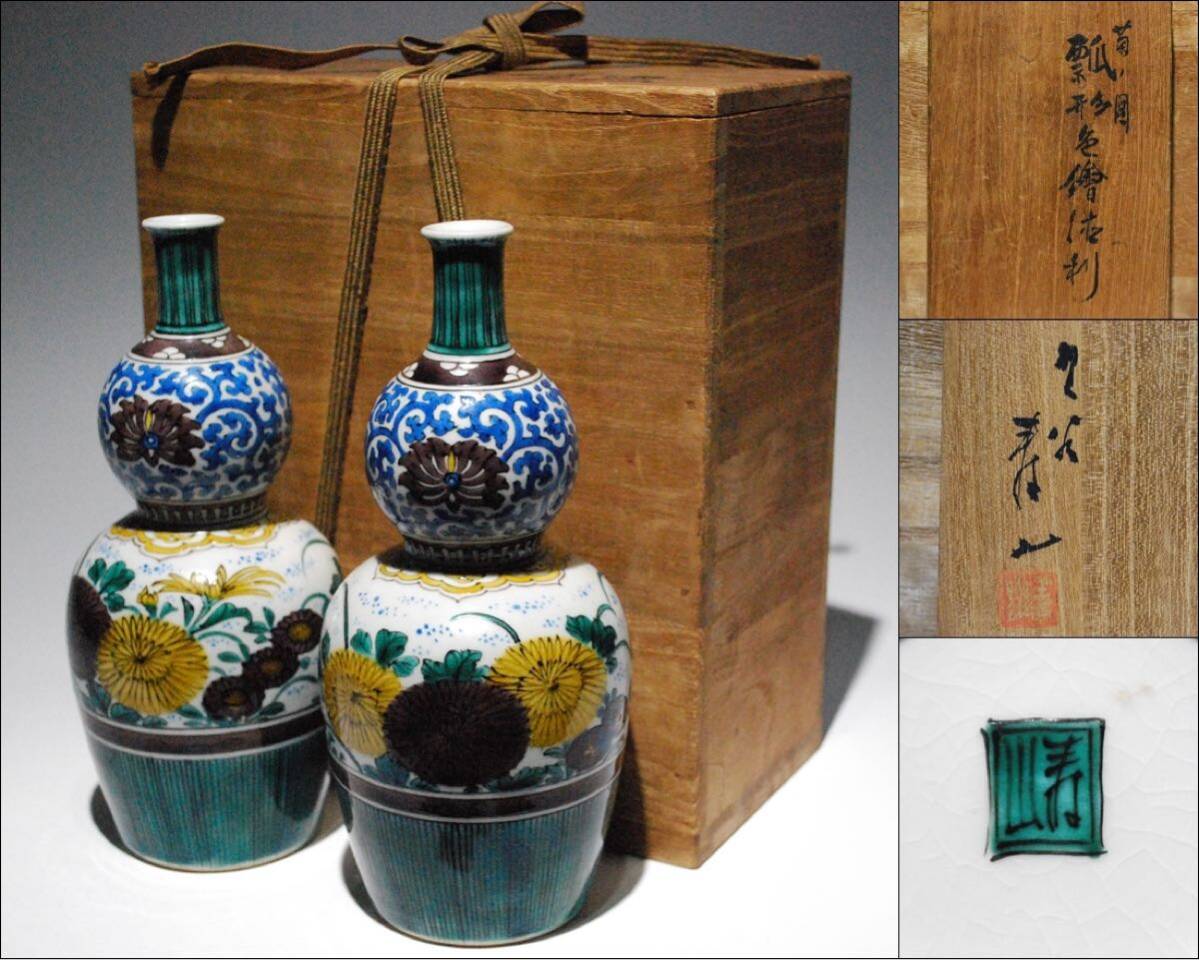 - 九谷焼 中嶋寿山 菊花図 瓢箪形 色絵 徳利 一対 共箱
