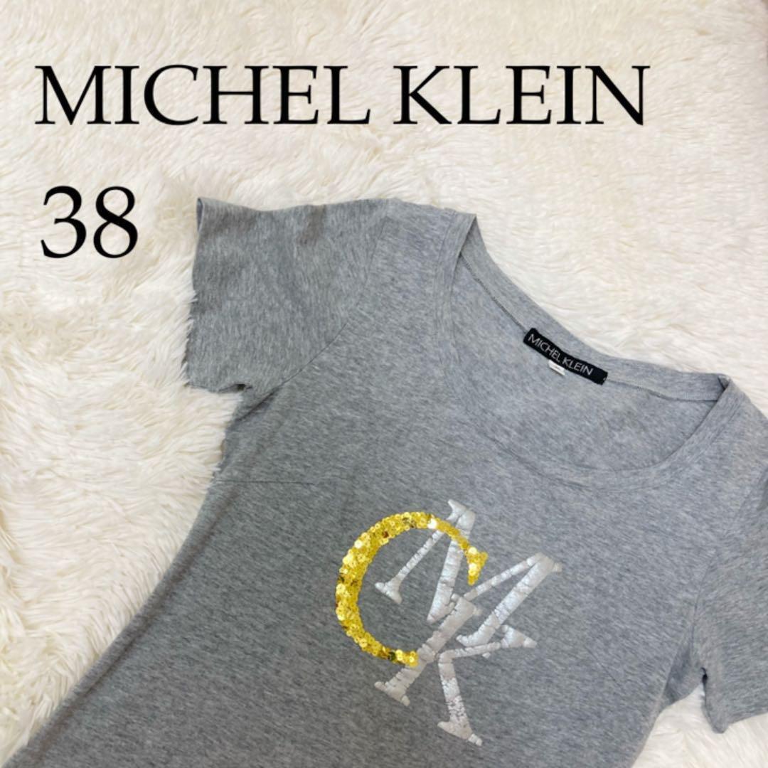 - 人気 ミッシェルクラン MICHEL KLEIN 丸首半袖カットソー Y2K Tシャツ ロゴスパンコール グレー 38 M