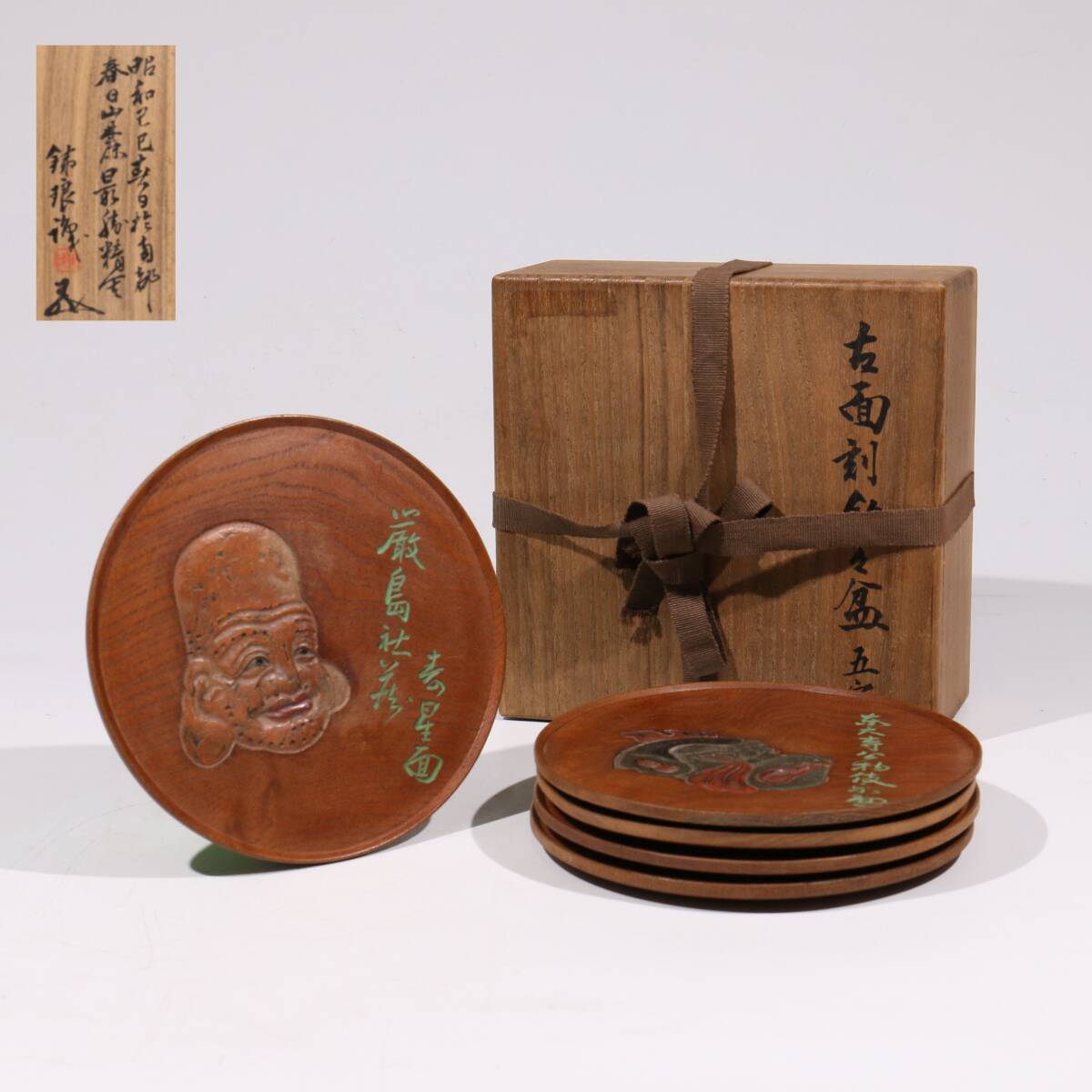 - 市川 銕琅 作 古面刻 古木茶盤 煎茶器