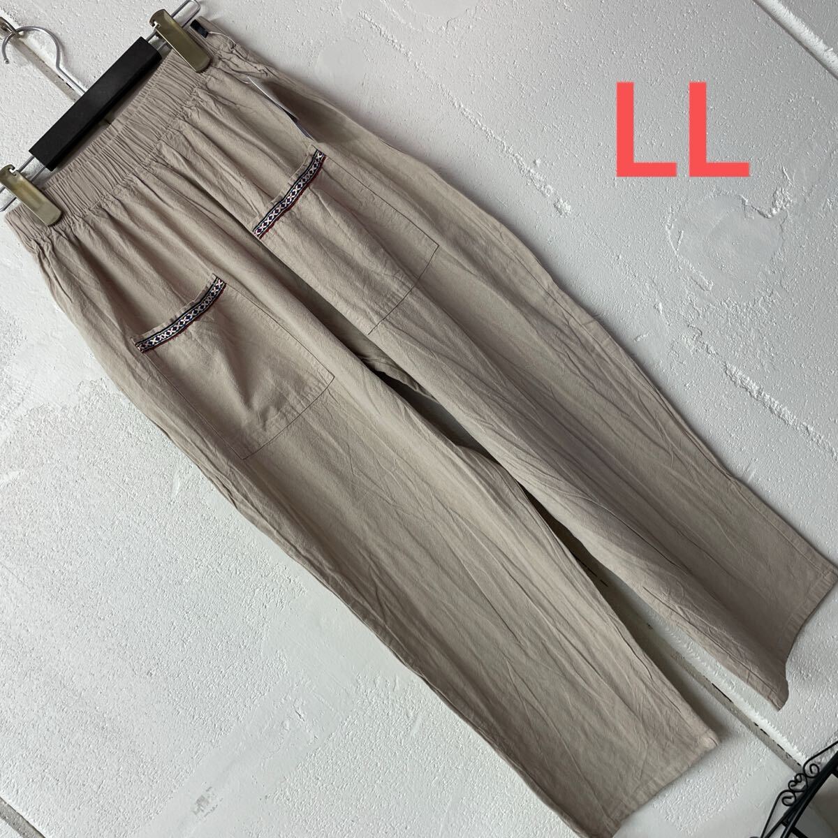 - LLサイズ綿100%ポケットテープ使いテーパードパンツ生成り