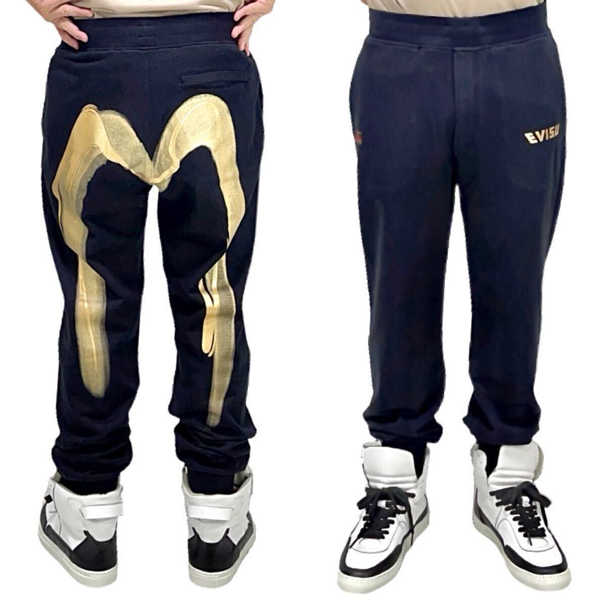 - 新品 EVISU HERITAGE エビス エヴィス ヘリテージ 金 ゴールド 一筆 手書き 和風 カモメ ステッチ ビッグプリント リブ スウェットパンツ M