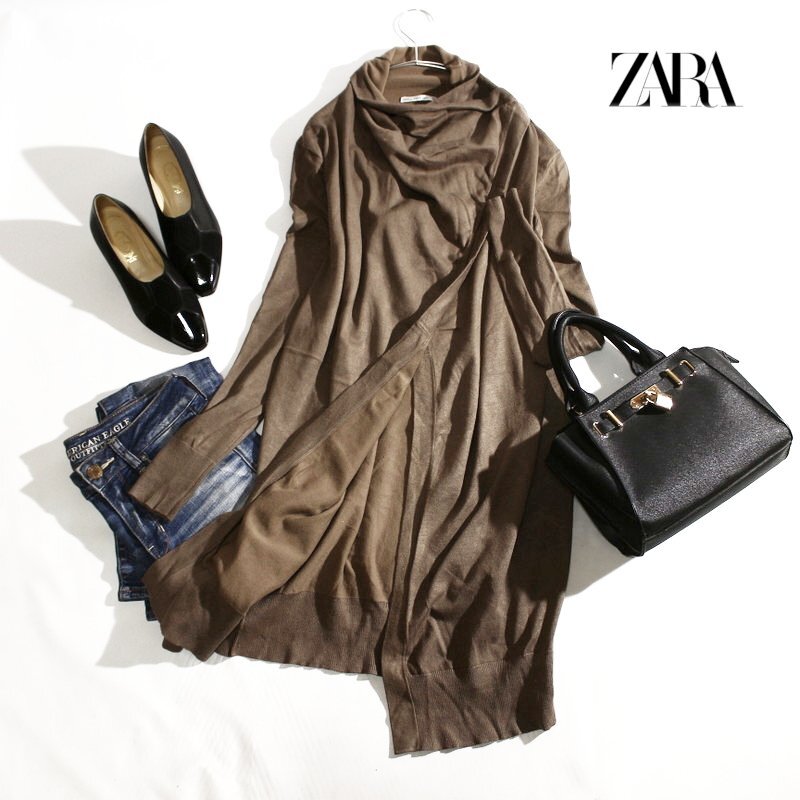 > 美品 ZARA knit ザラ ニット 合物 長袖 デザインニット ロングニット ロング丈 M グレイッシュ ブラウン セーター
