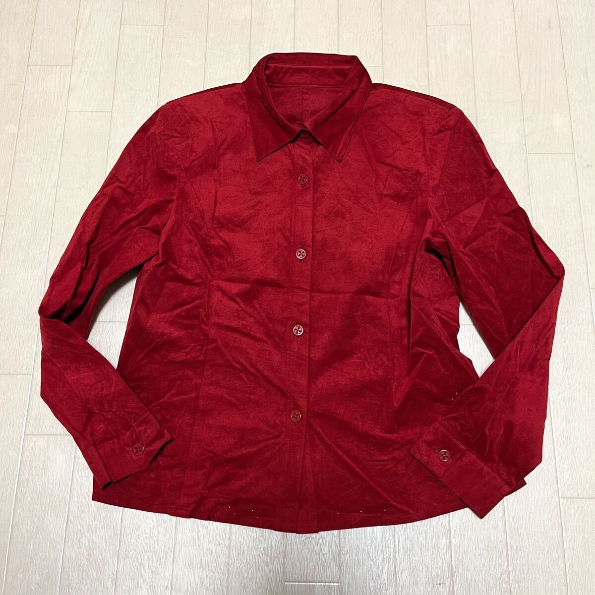- 和853★ Leilian レリアン 長袖 ボタンシャツ パンチング シャツジャケット フェイクスエード 日本製 9 レッド レディース