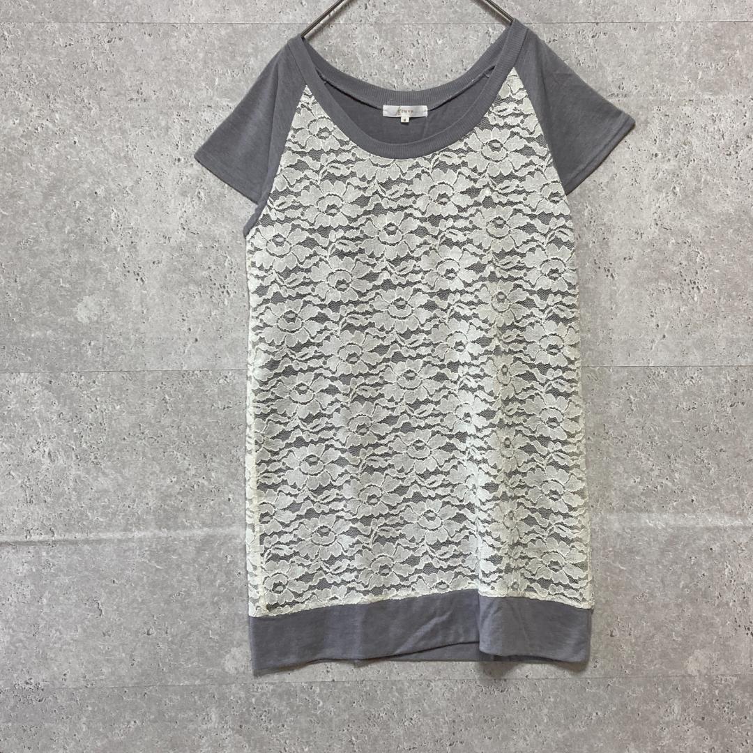 - 【grove】グローブ(M)半袖レースチュニック*伸縮性*ラウンドネック*グレー