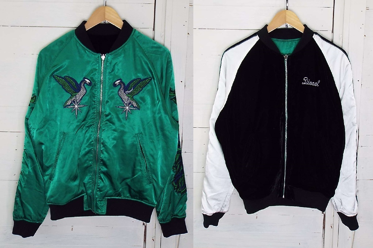 - T2714〇DIESEL(ディーゼル)スカジャン リバーシブル 刺繍 グリーン/ブラック Sサイズ