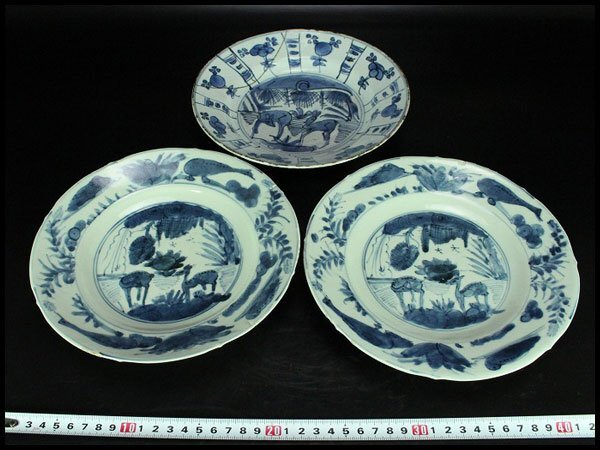 - 【金閣】中国美術 青花 草花鹿紋 盤 φ21cm 三件 旧家蔵出 送料無料(XA626)