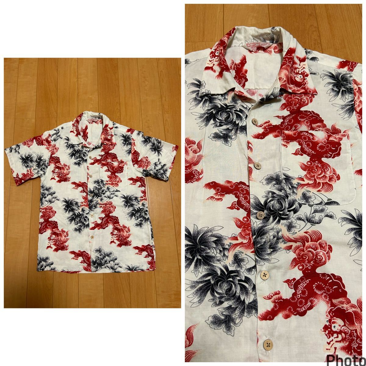 - 美品☆TROPICAL/和柄 メンズサイズM 半袖希少レーヨンアロハシャツ 獅子舞.狛犬&菊総柄・国花 ココナッツボタン Japanese ALOHA/唐獅子牡丹
