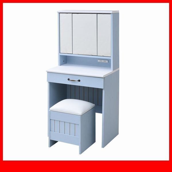 - ドレッサー★フレンチカントリー/三面鏡 ドレッサー 鏡台/椅子 スツール付き/コンパクト 幅60cm/コンセント付き 姫系/青 白/ffca-0004/zz