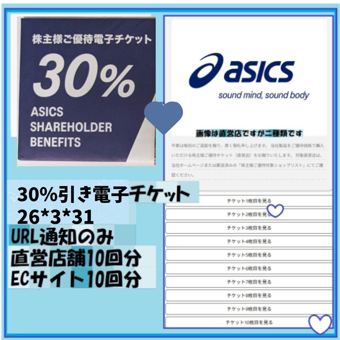- 20枚-30%割引 (直営店舗10枚+ECサイト10枚) アシックス asics 株主優待 電子チケット 二つのURL通知 26*3*31-優待で頂き新品未使用安心