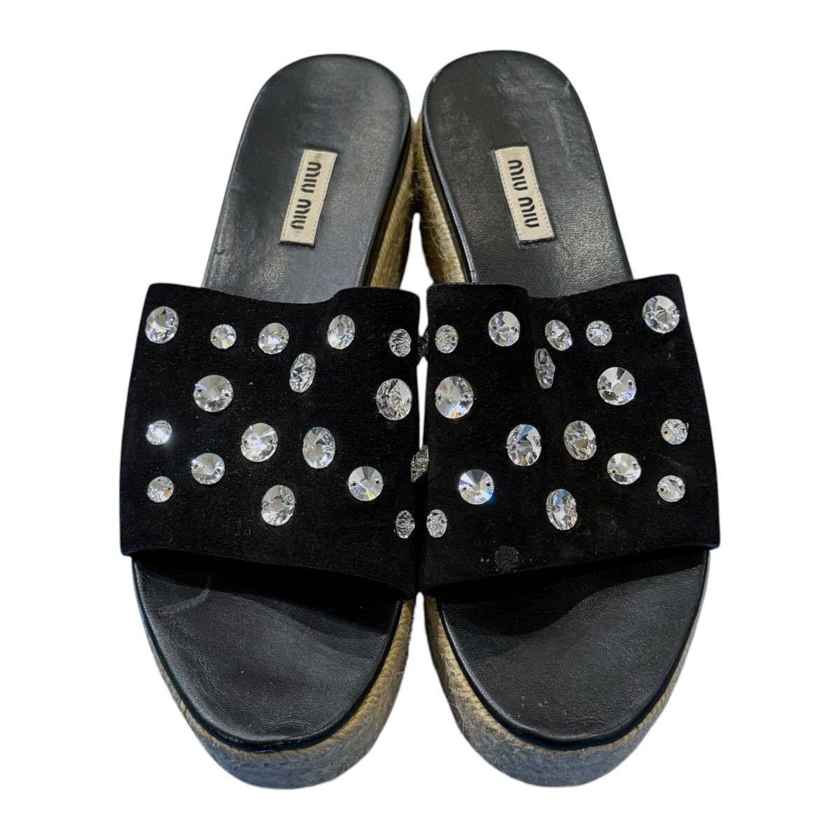 > ミュウミュウ クリスタル装飾 スリングバック レザーサンダルMIU MIU Crystal-Embellished Slingback Leather Sandals ブラック ビジュー