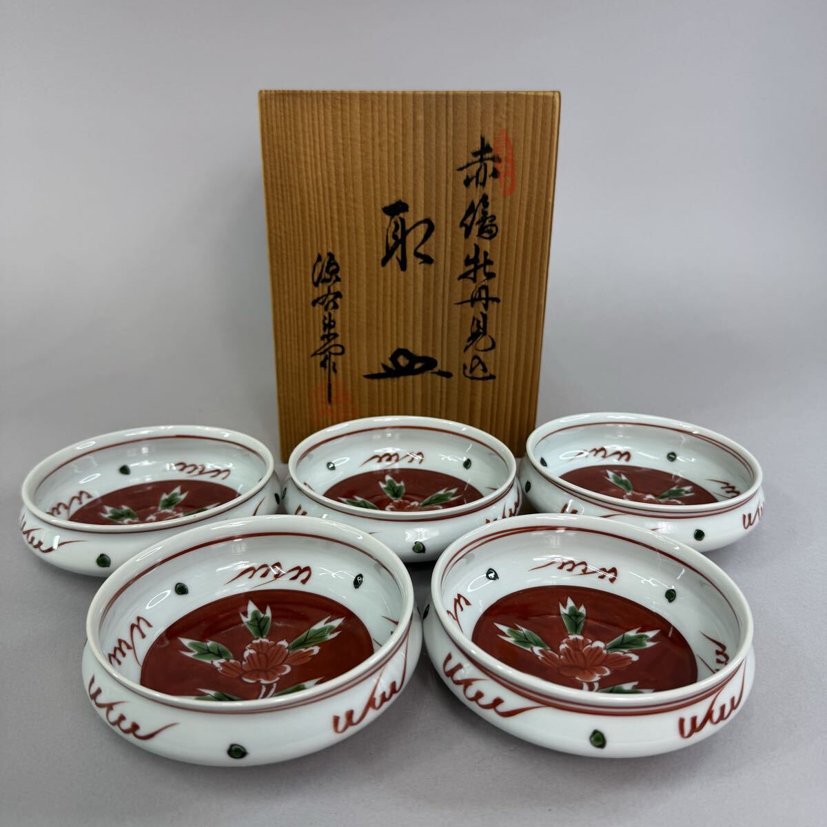 - 未使用品 有田焼 源右衛門 染錦 赤絵牡丹見込 取皿 5客セット