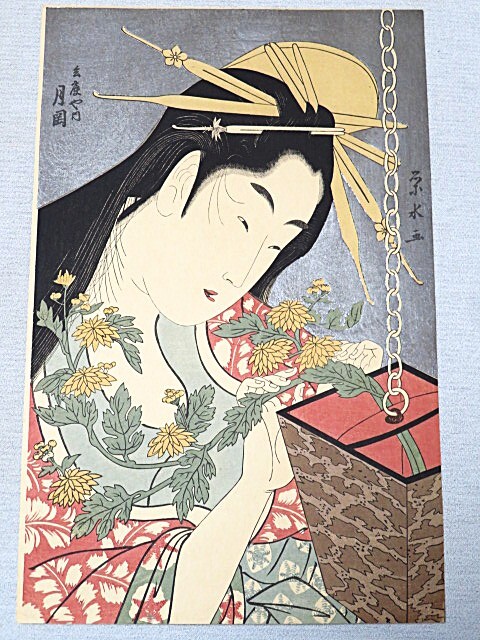 - 復刻版画 一楽亭栄水 兵庫屋内月岡 菊持つ美人 美人画 複製版画