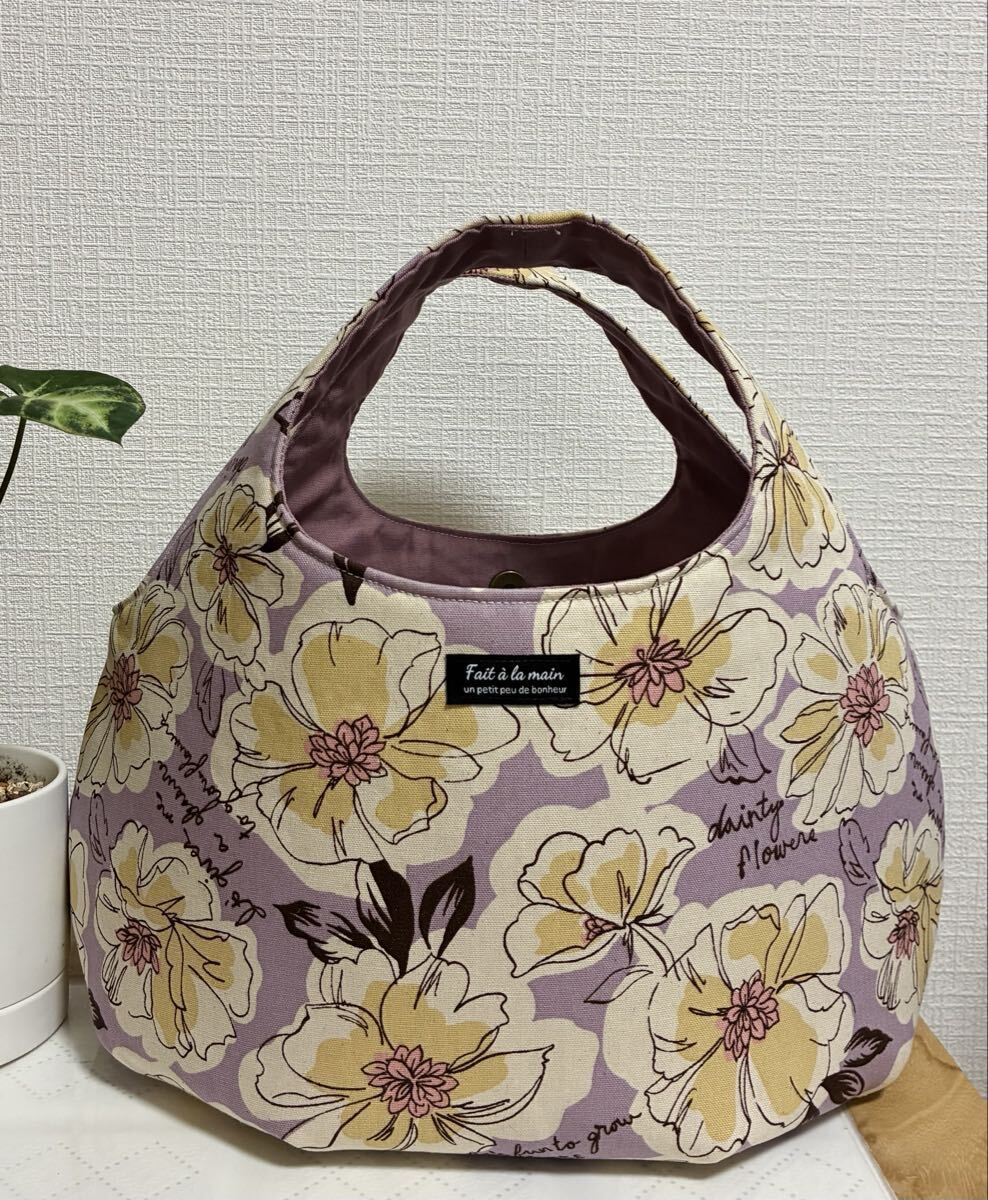 - ふんわり ころりんバッグ グラニーバッグ 丸底バッグ 布バッグ ハンドメイド布バッグ ころんとバッグ 花柄 パープル