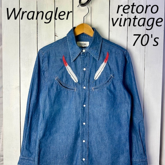 > sh●A49 美品 レトロ 70s Wrangler フェザー刺繍ウエスタンデニムシャツ M~L ラングラー オールド ヴィンテージ カウボーイ オリジナル